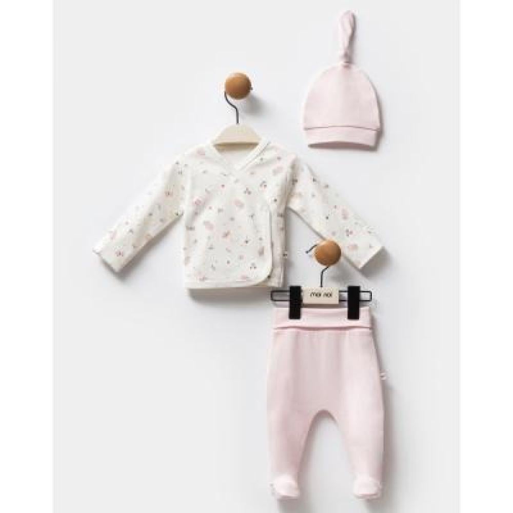 طقم مثالي للمولود الجديد مكوّن من ٣ قطع: كڤرّة ملفوفة بنقشة نقطية هادئة، بنطال وردي بقدمين مدمجة، وقبعة ناعمة بعقدة علوية.